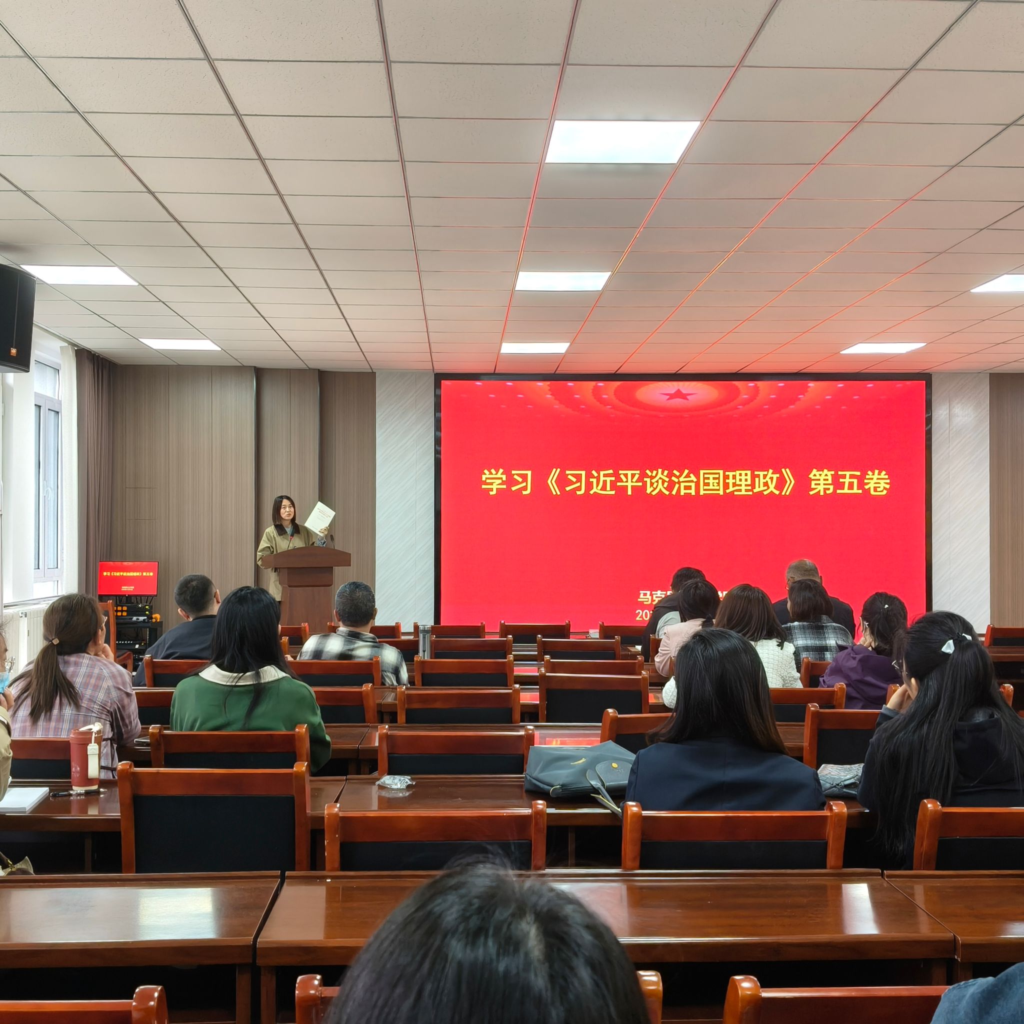 党委组织全体师生党员在秋实楼扩505会议室集体学习《习近平谈治国理政》第五卷,学院党政领导和全体师生党员参加了本次学习。