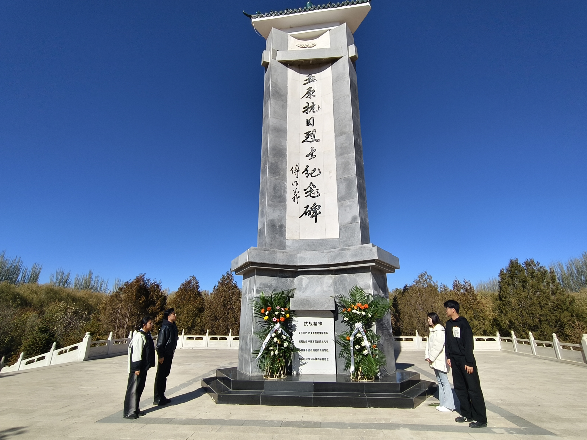 最后,在五原抗日烈士陵园举行了祭奠活动,师生代表为抗日烈士纪念碑敬献花篮并整理缎带,全体党员和入党积极分子进行了鞠躬默哀,以最庄重的仪式表达对抗日先烈的深切缅怀与崇高敬意,缅怀他们为国家和民族牺牲的奉献精神。